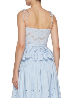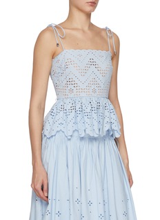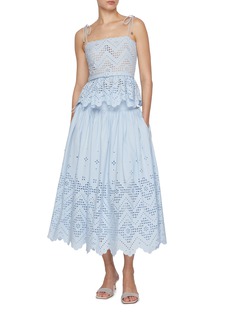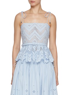 A whimsical ode to summer romance, this top by Self-Portrait is cut from broderie anglaise cotton in a delicate sky blue. Framed by scalloped edges and shoulder ties, its belted waist and floral cut-outs bring a sweet yet structured charm—perfect for garden parties or warm weather soirées.
