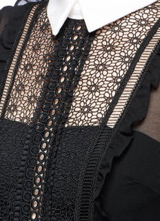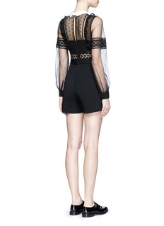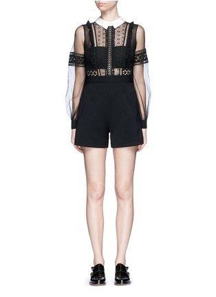 self-portrait充满优雅浪漫气息的设计令人倾心,此款连体裤更多了几分活力感,衣身及衣袖在雪纺的基础上加入品牌标志性的黑色蕾丝拼接,不同花纹的组合新颖优美,下半身采用高腰剪裁,令身型比例更显修长,高贵而不失活泼。