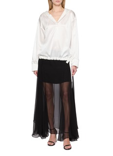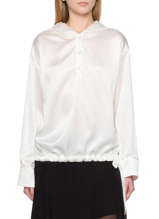 Sharon Wauchob 这款上衣以缎面材质衬出柔润光泽,连帽设计添松弛感,抽绳下摆可调节廓形,纯白调适配多风格。搭黑色半裙显反差质感,配同色系下装衬简约,是日常与轻造型场合都适配的精致休闲款。