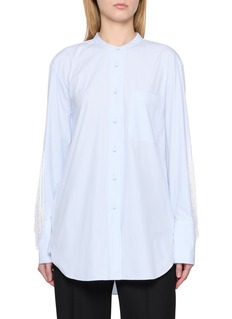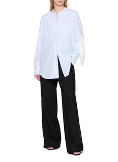 A crisp poplin shirt is reworked through Sharon Wauchob’s poetic lens, where precise tailoring meets expressive gesture. Fringe detailing cascades from the sleeves, softening the clean lines with movement—an artful contrast suited to gallery days or elevated everyday dressing.