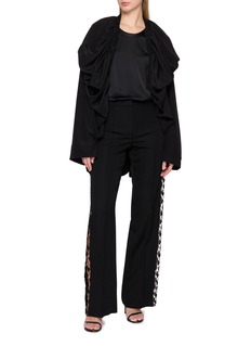 A sculptural blouson shaped by Sharon Wauchob’s signature draping, where gathered folds create a soft bubble effect across the shoulders and back. Finished with a tie waist, it balances volume and control—layered over tailored separates for an expressive yet restrained silhouette.