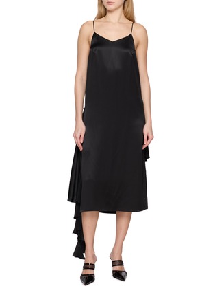 Sharon Wauchob 以这款吊带裙,尽显精致优雅的典范。流畅的剪影与低调光泽交织出隽永魅力,纤细吊带与简约 V 领彰显极简美学,裙摆独特的不对称荷叶边设计增添现代韵律,随步伐摇曳生姿,演绎戏剧性张力。