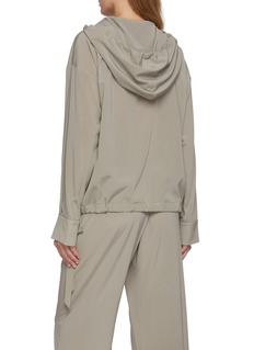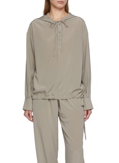 Sharon Wauchob 的作品以对材料和面料的独特实验性使用而著称,融入了褶皱、垂褶和多种精致细节,流露着非传统典雅格调。这款上衣选用顺滑真丝面料打造,将街头帽衫元素转化为高级时装语言,适合日夜多场合穿搭。