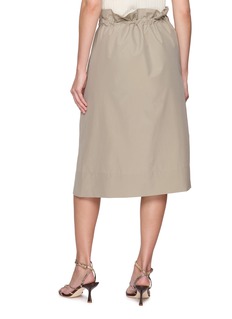 Sharon Wauchob 的作品以对材料和面料的独特实验性使用而著称,融入了褶皱、垂褶和多种精致细节,流露着非传统典雅格调。这款半裙以褶裥细节塑造立体层次,抽绳设计增添随性实用感。