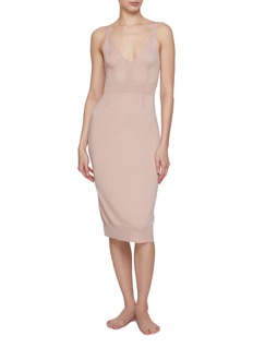 Indulge in supremely sophisticated Merino Silk Seamless Knit fabric slip dress. The bralette's intricate pointelle design complements your silhouette, while the slip dress boasts an elegant Shleep half moon motif. Its sleek, body-hugging fit suits all body types, promising an unparalleled sleep experience.