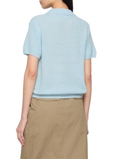 In this Sienne knit, airy texture meets a serene, pastel tone that brings a fresh softness to the classic polo silhouette. The lightweight wool blend drapes gently, while the ribbed collar and tonal chest pocket add quiet structure. An easy, uplifting piece to balance tailored trousers or denim with subtle charm.