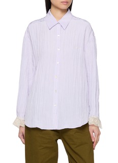 A whispery texture meets delicate detailing in this Sienne shirt, crafted with a softly crinkled finish that moves with ease. Lace-trimmed cuffs introduce a romantic contrast, while the relaxed silhouette offers an effortless balance between tailoring and lightness—perfect for layering from weekday edits to weekend styling.