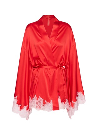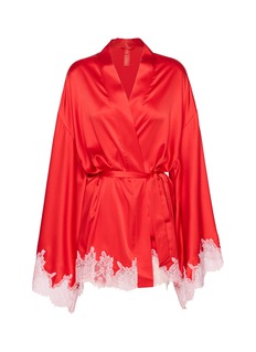 SKIMS 这款短款睡袍采用丝滑柔亮的织光面料制成,让您梳妆打扮时倍感舒适。宽松袖口设计,精致蕾丝镶边,腰间配有同色系系带。