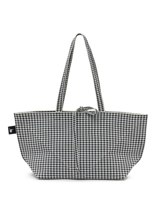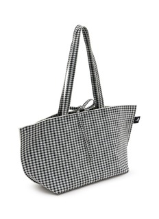 Softromaine's Origami Rectangle Big Tote combines sustainability with sleek geometric design. The lightweight silhouette features recycled plastic bottle yarn construction through 3D knitting technique, classic gingham pattern, adjustable tie closure, dual shoulder straps, and folds completely flat. Eco-conscious versatility meets effortless everyday style.