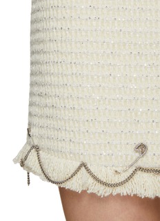 SOONIL 专注于探索人们普遍认同的美的概念,重点在于版型和面料的研究,简约的廓形、合身的裁剪展现出身体的流线美。这款半裙以裙摆的仿水晶别针及链条缀饰为亮片粗花呢面料带来双重闪耀质感。