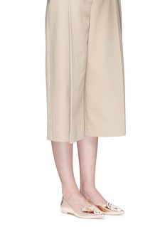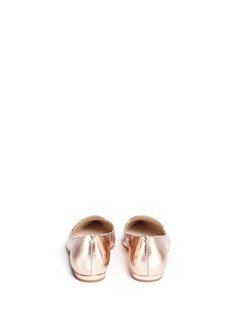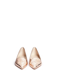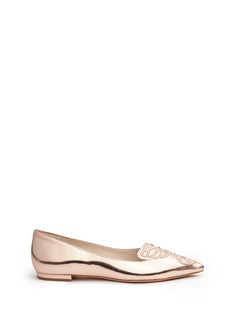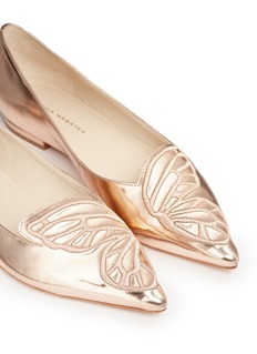 蝴蝶是Sophia Webster最具代表性的设计元素,此款平底鞋亦以此为蓝本,于鞋头缀以细致的蝴蝶翅膀刺绣,左右脚拼在一起便是完整的图案,别具巧思,配以抢眼的玫瑰金色小牛皮,充满优雅高贵魅力。