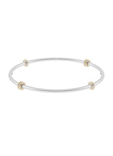 The Kini Bangle is comprised of a single, full-round bangle crafted from sterling silver and features four quadrants of orbiting annulets in contrasting gold. Added nodes ensure the unfixed annulets are viewable from all directions, providing a tactile experience and contrasting display.