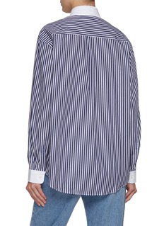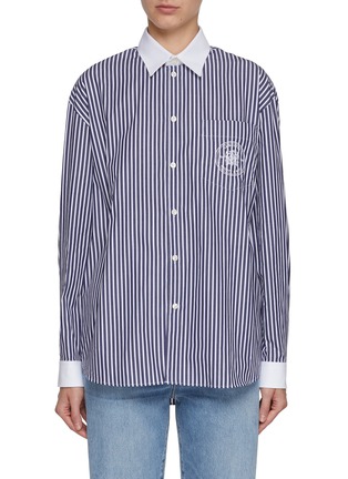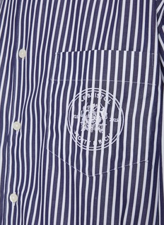Channel classic charm with the Sporty & Rich striped shirt, a sartorial staple that effortlessly combines preppy style with a casual edge. This shirt features bold vertical stripes in blue and white, accented with a contrasting white collar and a subtle embroidered logo on the chest pocket. Perfect for both office wear and weekend outings.