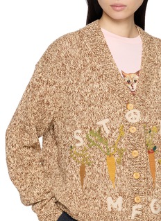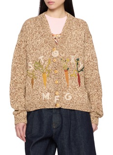 Embrace a playful and environmentally conscious style with this STORY MFG cardigan. The piece features a unique earthy tone achieved through natural dye processes, highlighting the brand's commitment to sustainable fashion. The cardigan is adorned with whimsical embroidered details including the label’s name and charming nature-inspired motifs, adding a touch of whimsy and individuality. Crafted from organic materials, this garment not only makes a style statement but also supports eco-friendly practices.
