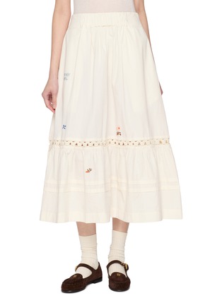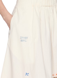 This STORY MFG skirt is a delightful expression of artisanal craftsmanship and sustainable fashion. Crafted from organic cotton, this skirt is gentle on the skin and the environment. Its soft, off-white hue serves as a versatile base, adorned with delicate embroidered motifs that add a touch of playful charm. The tiered design, accentuated with intricate lace inserts, provides a beautiful texture and volume, making it perfect for a breezy day out.