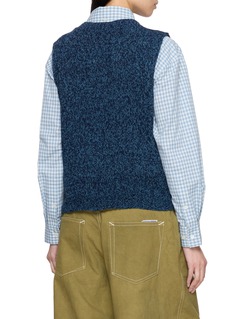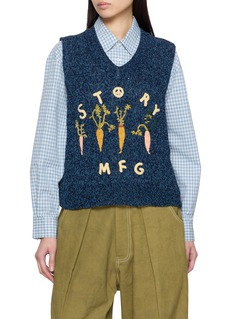 Elevate your layering game with this enchanting STORY MFG knitted vest. Crafted from premium, sustainable fibers, this piece features a deep navy hue interspersed with a subtle texture that enhances its visual appeal. The front is adorned with vibrant, hand-embroidered illustrations of vegetables and the brand's logo, adding a playful and unique touch. This sleeveless vest exudes a charming rustic vibe, perfect for pairing over light shirts or under jackets, making it a versatile addition to any eco-conscious wardrobe.