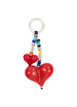 String Ting's romantic bag charm features sculptural lucite heart pendants in graduating sizes suspended from a kaleidoscope of hand-strung glass beads and metallic accents. The playful design combines glossy resin hearts with vibrant cube and round beads, secured to a polished metal ring. A bold love letter accessory that brings joyful personality and artisanal charm to bags and keys.