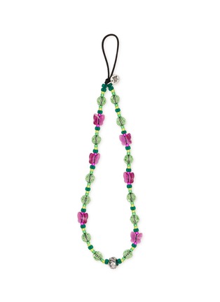 String Ting's nature-inspired phone strap showcases hand-strung butterfly charms alternating with faceted crystal beads and branded detailing. The whimsical design captures garden-fresh charm through its playful repetition of sculptural motifs and shimmering glass accents. A nostalgic Y2K accessory that brings artisanal craftsmanship and joyful personality to everyday essentials.