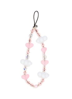String Ting's romantic phone strap features hand-strung lucite heart charms alternating with iridescent crystal beads and lustrous pearl accents. The playful design captures nostalgic Y2K charm with its dreamy combination of translucent hearts and shimmering faceted beads. A whimsical accessory that transforms your phone into a wearable love letter.