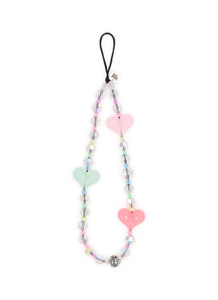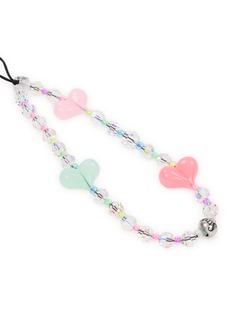 String Ting's enchanting phone strap features hand-strung lucite heart charms interspersed with iridescent crystal beads in varying sizes and branded detailing. The dreamy design creates a romantic gradient through shimmering faceted glass and metallic accents. A whimsical Y2K-inspired accessory that transforms your phone into a wearable love letter with secure cord attachment.