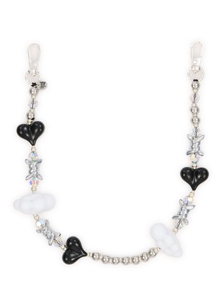 String Ting's romantic phone strap features sculptural heart and candy-wrapper charms alternating with iridescent crystal beads, lustrous pearls, and polished metallic accents secured by dual swivel clasps. The whimsical design celebrates love and sweetness through glossy resin motifs and shimmering glass. A playful Y2K accessory offering versatile attachment to phones, bags, or keys with artisanal charm.