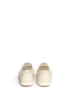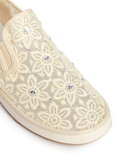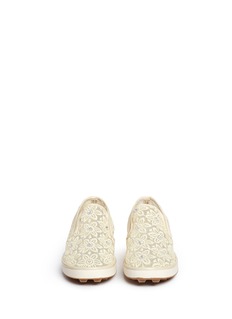 斯图尔特韦茨曼将优雅的风格带入童鞋设计,这款平底便鞋采用米色花卉蕾丝,配以透明仿水晶点缀,透出清新优雅气息,柔软的鞋床结合鞋舌的松紧拼接,倍感舒适,展现孩子甜美可爱的个性。