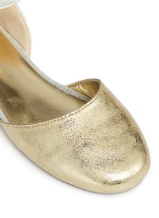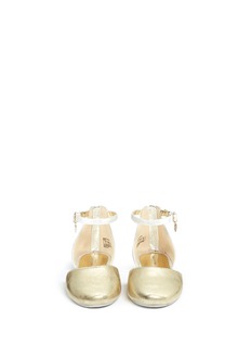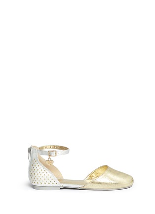 斯图尔特韦茨曼将优雅的风格带入童鞋设计,这款平底鞋借鉴奥赛鞋的廓形,改以圆头款式,带来更舒适的穿着体验,鞋后跟加入银色几何镂空拼贴,与香槟金色纹理鞋身相呼应,透出孩子优雅高贵的格调。