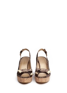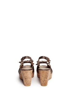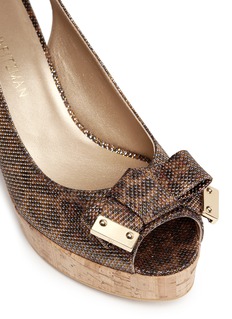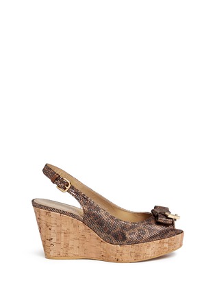斯图尔特韦茨曼这款坡跟鞋以闪亮别致的鞋面吸人眼球,并独具匠心地将豹纹图案隐藏其中,前卫个性,软木坡跟鞋底轻便舒适,并能拉长身体线条,既优雅又实穿,是都市女性打造休闲造型的首选。