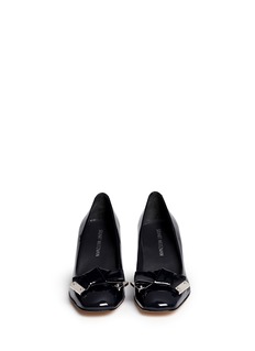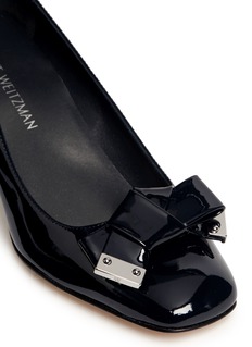 高跟鞋不仅能拉长腿部线条,更展现婀娜多姿的女人味。斯图尔特韦茨曼这款以光滑而富有光泽的深蓝色漆皮打造,方形鞋头上的蝴蝶结可爱中又带着知性味道,为整体设计注入时尚活力,展现您简约优雅的个性。