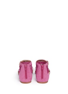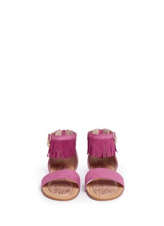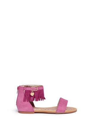 斯图尔特韦茨曼将优雅的风格带入童鞋设计,这款平底凉鞋的粉红色绒面表层透出甜美优雅气息,踝带设计配以流苏点缀散发民族风情,随步履轻摆,展示出孩子活泼好动的个性。