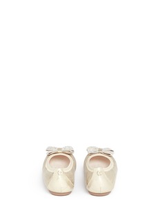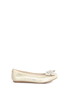 斯图尔特韦茨曼将优雅的风格带入童装鞋履,这款平底鞋的蝴蝶结饰缀以幻彩珠饰,与香槟金色纹理鞋身相呼应,柔软舒适的鞋床结合松紧鞋口的设计让孩子灵活走活,展现甜美可爱的个性。
