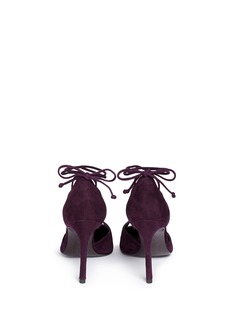 斯图尔特韦茨曼这双高跟鞋完美烘托出女性高贵优雅的气质,选用深紫色绒面皮营造浪漫氛围,并结合了经典的尖头及侧空设计,鞋口呈现独特的波浪形设计,以系带环绕脚踝,散发性感大气魅力。