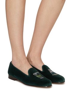Stubbs and Wootton presents this pair of velvet loafers, captivating with their sophisticated playfulness. Adorned with a whimsical embroidery of absinthe-containing shot glasses, this pair will elevate your ensembles with an air of elegance.