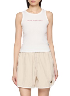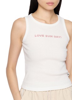 A sparkle of optimism for hot city afternoons, SUNDAYFRUITMARKET’s tank is cut from supple ribbed cotton that skims the figure, its embellished slogan catching the light like midday rays. Style solo with denim or slip beneath airy tailoring for a glint of weekend joy.