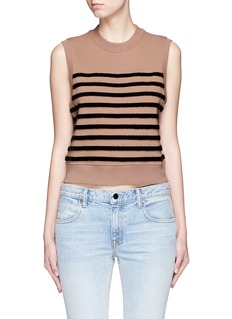 这款T by Alexander Wang的背心贯彻品牌的运动休闲气息,直筒剪裁透出中性格调,衣身的黑色植绒条纹图案与裸色主调十分搭调,抓毛内里提升了舒适度,可搭配浅色牛仔裤,打造活力满满的休闲造型。