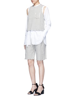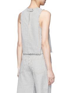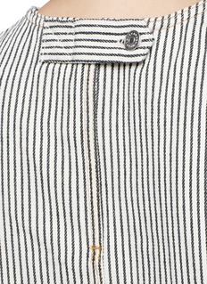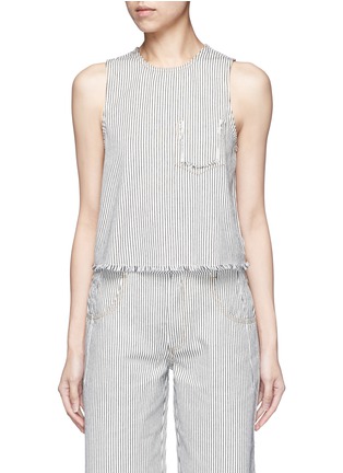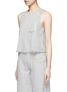 T by Alexander Wang的基本款单品十分适合都市时尚女士,这款象牙白纯棉背心饰以细密的黑色竖条纹,摩登清新。正面一个口袋轮廓须边缝线装饰新颖有趣,配以须边衣摆,细节更具玩味。您可搭配同款短裤,演绎条纹魅力。