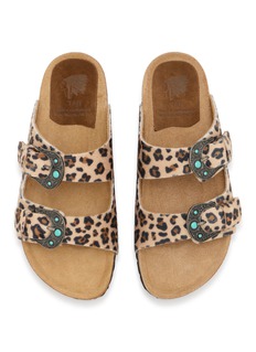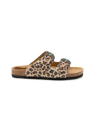 Taji 是意大利鞋履品牌,以印第安旅行符号“Taji”为图腾,将美洲草原的辽阔与自由缝进每一双鞋,让穿着者把远方的风与故事随身带走。这款双带扣凉鞋配有绿松石色点缀,鞋面采用豹纹图案面料剪裁,配有符合人体工学的鞋底。