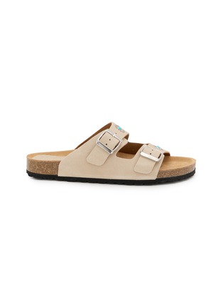 Taji 是意大利鞋履品牌,以印第安旅行符号“Taji”为图腾,将美洲草原的辽阔与自由缝进每一双鞋,让穿着者把远方的风与故事随身带走。这款双带扣凉鞋配有绿松石色点缀与金属细节,鞋面采用绒面皮剪裁,配有符合人体工学的鞋底。