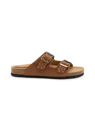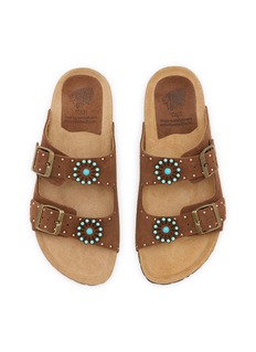 Taji 是意大利鞋履品牌,以印第安旅行符号“Taji”为图腾,将美洲草原的辽阔与自由缝进每一双鞋,让穿着者把远方的风与故事随身带走。这款双带扣凉鞋配有绿松石色点缀与金属细节,鞋面采用绒面皮剪裁,配有符合人体工学的鞋底。