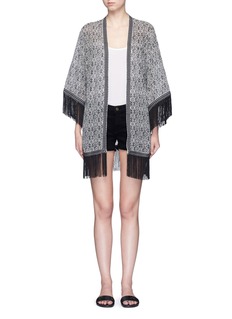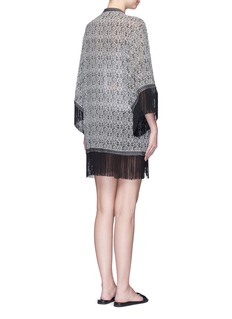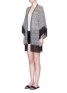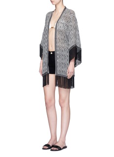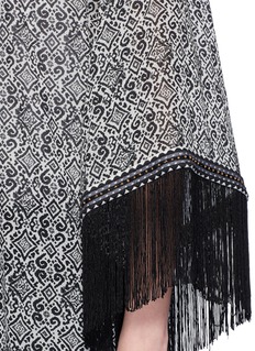 Talitha从古著及世界各地的文化获取灵感,结合出众做工,表现奢华波西米亚风格。此款外套利用真丝面料营造轻柔飘逸感觉,通身黑灰色民族印花配以刺绣及串珠装饰,洋溢浓郁的异国风情,袖口及下摆附有长流苏,走路时更显大气优雅。