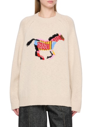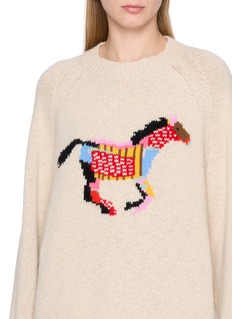 Rendered in plush heavyweight cashmere, this crewneck sweater is animated by a playful horse intarsia that nods to The Elder Statesman’s joyful craft ethos. A statement layer with artisanal charm, it pairs effortlessly with denim or tailored trousers for relaxed, expressive winter dressing.