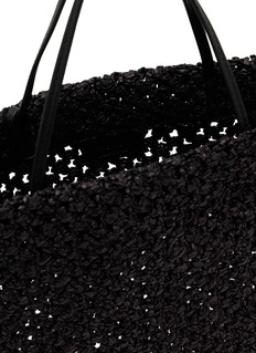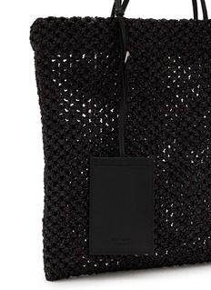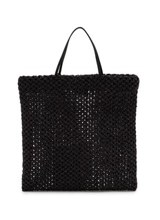 The Row's woven tote showcases artisanal macramé craftsmanship in a relaxed, open-weave construction. The spacious square silhouette with slim shoulder straps balances bohemian texture with refined minimalism, while the airy mesh design offers breathable functionality. A sophisticated summer essential that elevates everyday carry with quiet luxury.