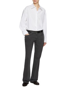 The Row 巧用面料和剪裁,一展体现“引人注目”的低调奢华魅力。这款牛仔裤采用质感纯棉面料剪裁低腰直筒裤型,搭配腰带、白衬衫,轻盈气质亮相职场。
