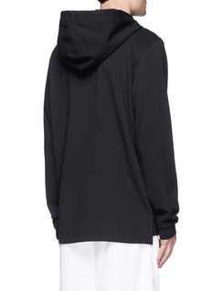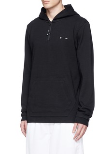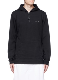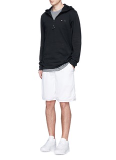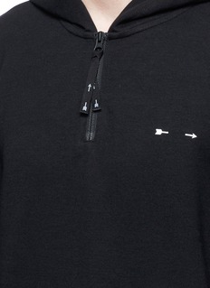 THE UPSIDE通过特制面料及印制技术打造一系列适合不同活动穿着的运动服。这款上衣款式简约,仅以白色标志性的箭头胶印点亮黑色主调,连帽款式配以柔软舒适的混棉面料,不论配搭运动装束,或打造随性街头造型均显得潇洒随性。