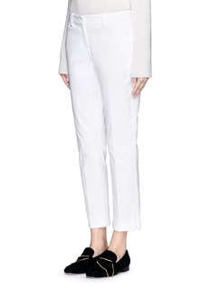 希尔瑞这款九分裤的设计展现简约时尚的魅力所在,利落的剪裁勾勒女性笔直修长的腿部线条,裤脚加上小开衩细节,配上明亮的白色,轻松展示摩登休闲风格。