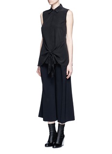 这款黑色真丝衬衫延续希尔瑞极简摩登的风格,于正面饰以扭结装饰,丰富了服饰层次感,无袖设计带来清爽干练的感觉。您不妨搭配黑色下装,以全黑造型令身材更显高挑,展现酷感冷艳的魅力。