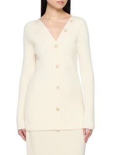 A refined reinterpretation of the classic cardigan, this merino wool style is defined by its elongated rib construction and versatile open-back silhouette. Designed with a deep V neckline at both the front and back, it can be worn buttoned traditionally or reversed for an effortless, modern look. Sculpting the body with a clean, streamlined fit, this piece offers quiet luxury and understated sensuality in equal measure.