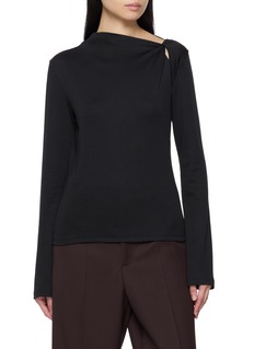 Theory channels quiet drama into this fluid Pima cotton top, defined by its asymmetric slash neckline gathered into a sculptural twist. The clean silhouette elevates everyday dressing with a subtle artfulness—perfect with wide-leg tailoring or minimal jewellery for a modern, refined mood.