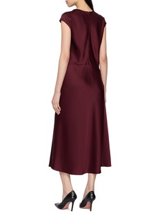 Sculpted drapery defines this twist bodice dress, crafted from satin triacetate that glides with a luminous, fluid sheen. The artfully knotted front creates a wrapped, organic contour, while the clean A-line skirt offers effortless poise from cocktail settings to contemporary evening affairs.