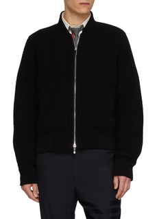 Thom Browne, where traditional tailoring meets modern aesthetics. Detailed with the label's iconic 4-bar stripe, this bomber jacket is crafted from a textured waffle knit to lend a tactile finish to your athleisure looks.